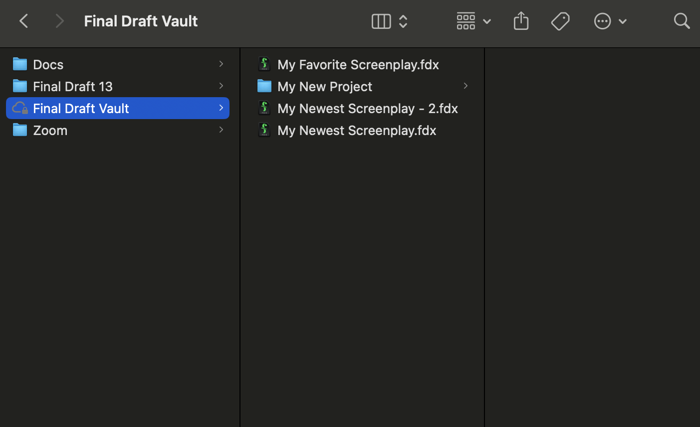 Once installed, it will create a file in your Documents folder called "Final Draft Vault." Anything that is added to this Final Draft folder will be automatically synced to Final Draft Vault, and you'll be able to view it via the local folder or by logging into your Cloud account: