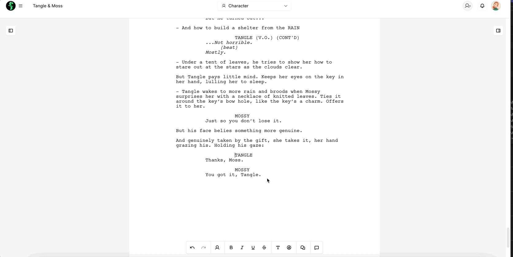 Once your elements are correctly positioned, click your cursor next to the first Character element. The two dialogue bubbles in the floating toolbar will color in:
