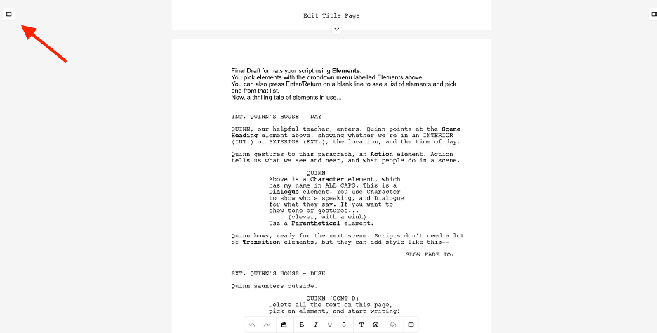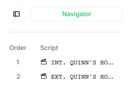This will open the Basic Navigator. Scenes are separated by Scene Heading, so each new Scene Heading will be listed as a new scene. Any time a new Scene Heading is added to your script, you will see it appear in the Basic Navigator.