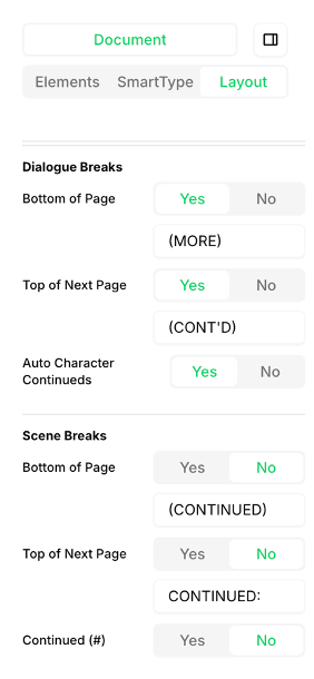 Select “Yes” and the text in this box will appear at the bottom of the page when there is a break in dialogue. This text may be edited but (CONTINUED) is standard.