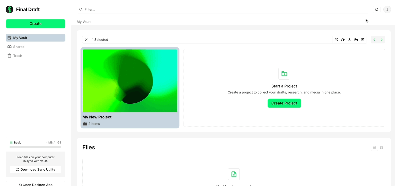 Once your contact is in your address book, you can share a file or even an entire Project with from them from your Vault. To do so, find the file in question in your Vault and click the Share button (you can also do this with the file open in Writer by going to File > Share).