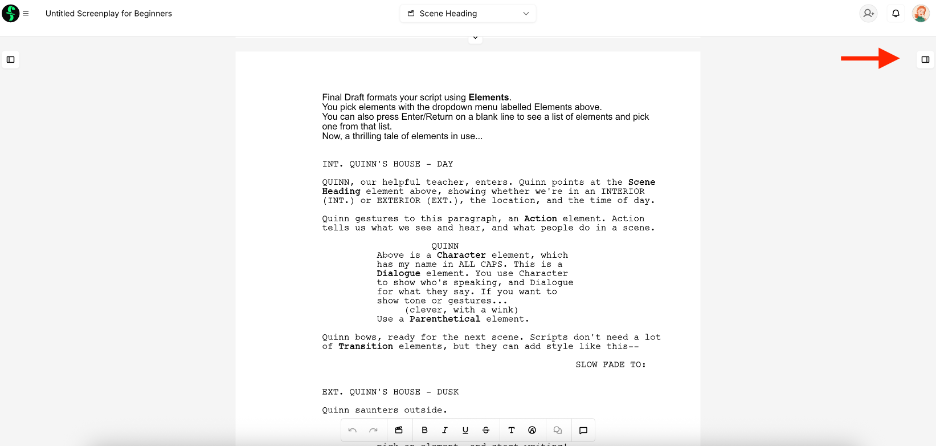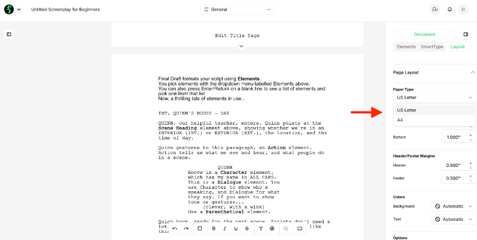 Final Draft has two paper sizes, US Letter and A4. To switch from one to another, you can click the button on the right side of your screen: