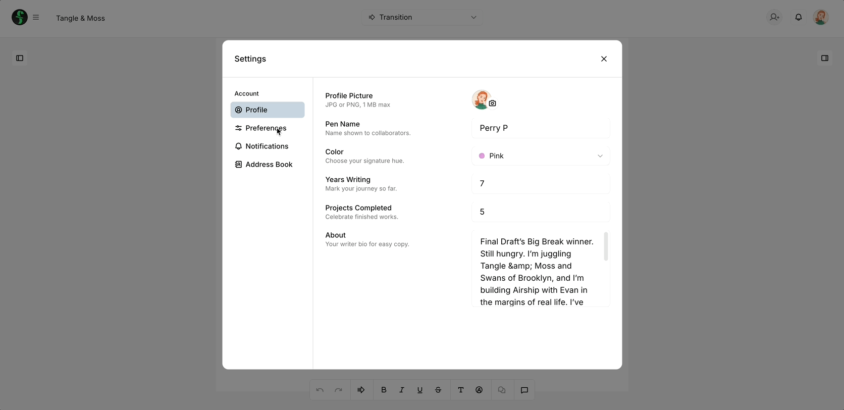 If you would prefer to remove the Floating Toolbar entirely, you can change your Preferences. In the upper righthand corner of your screen, click your Profile. From the resulting dropdown menu, choose "Settings."