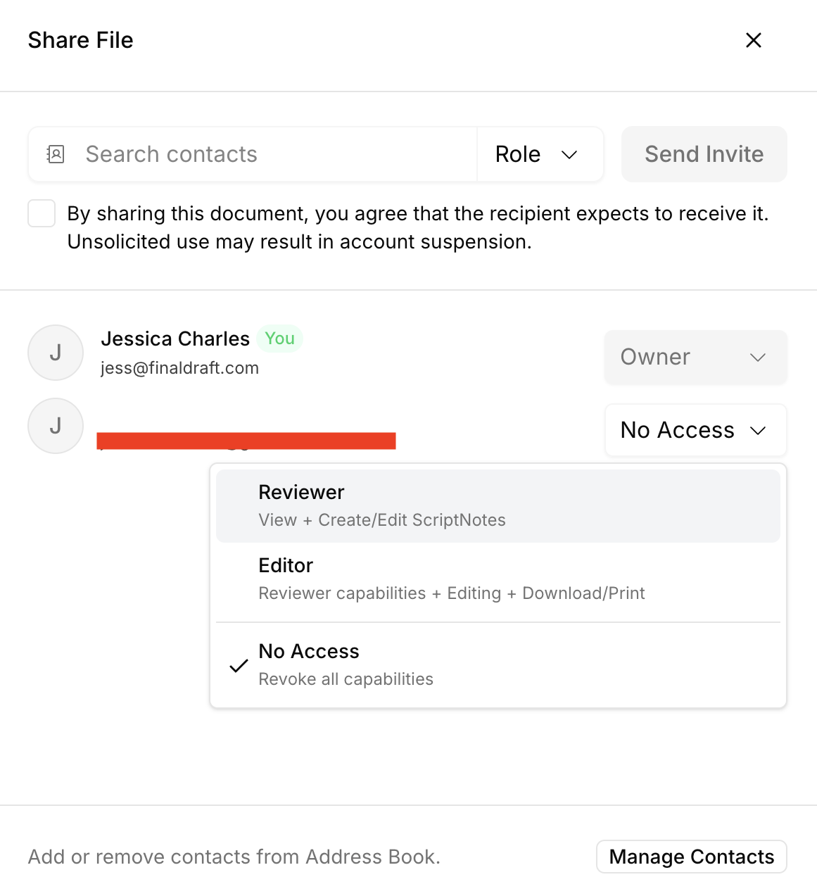 If a contact is a Reviewer, they are able to view the file and it's contents, but not make any changes. They are able to create, edit, and view ScriptNotes, but cannot make edits to the file itself.